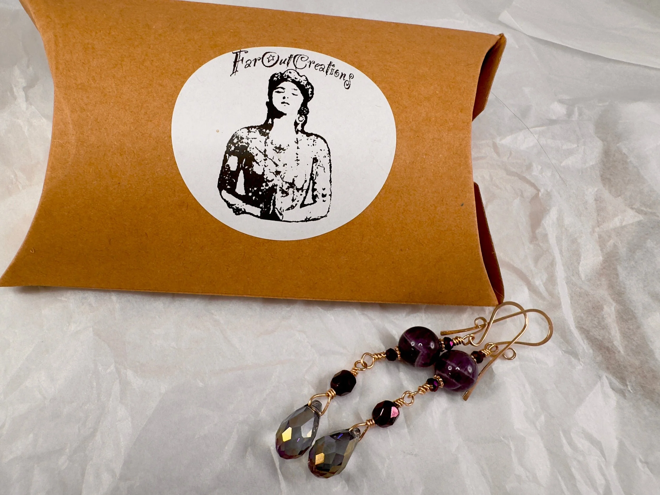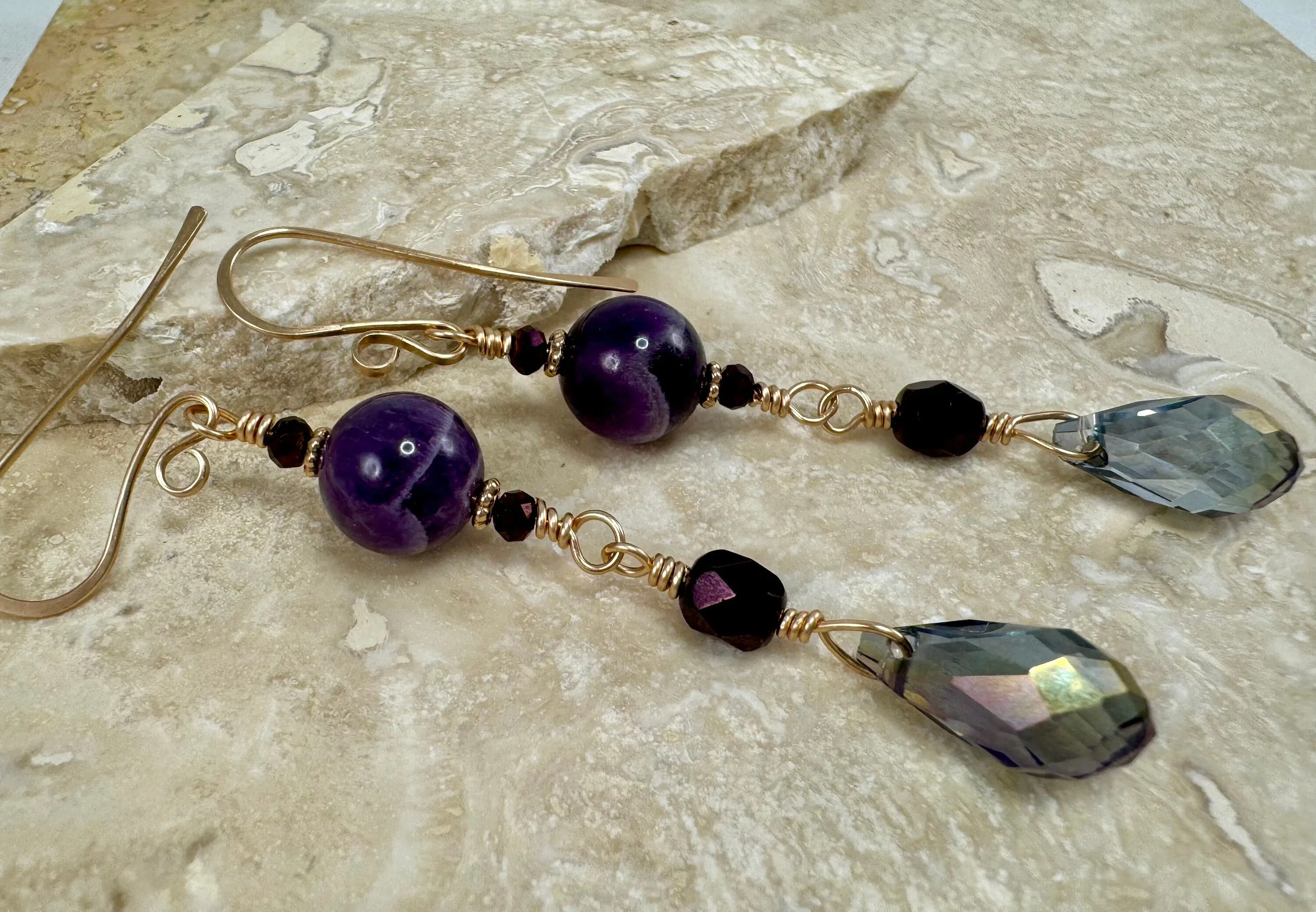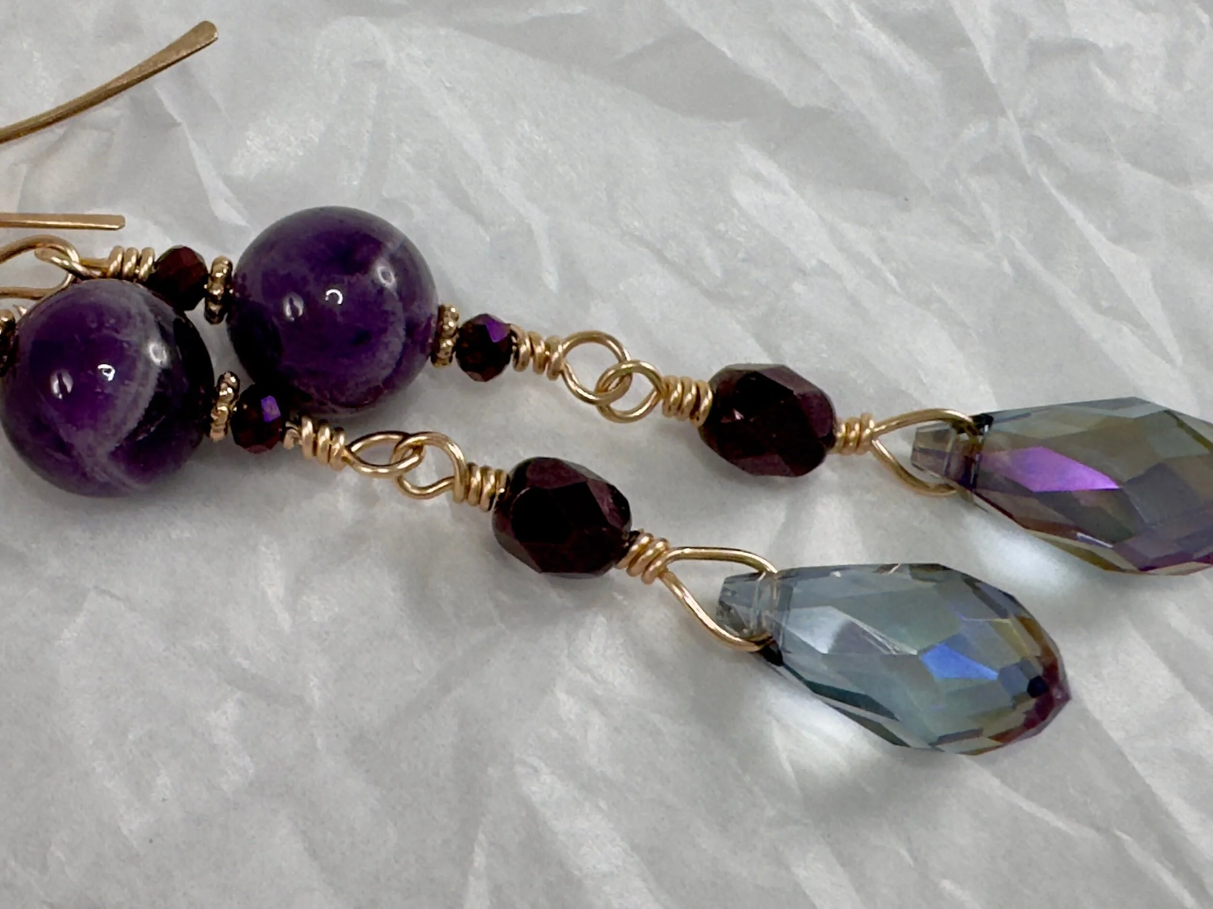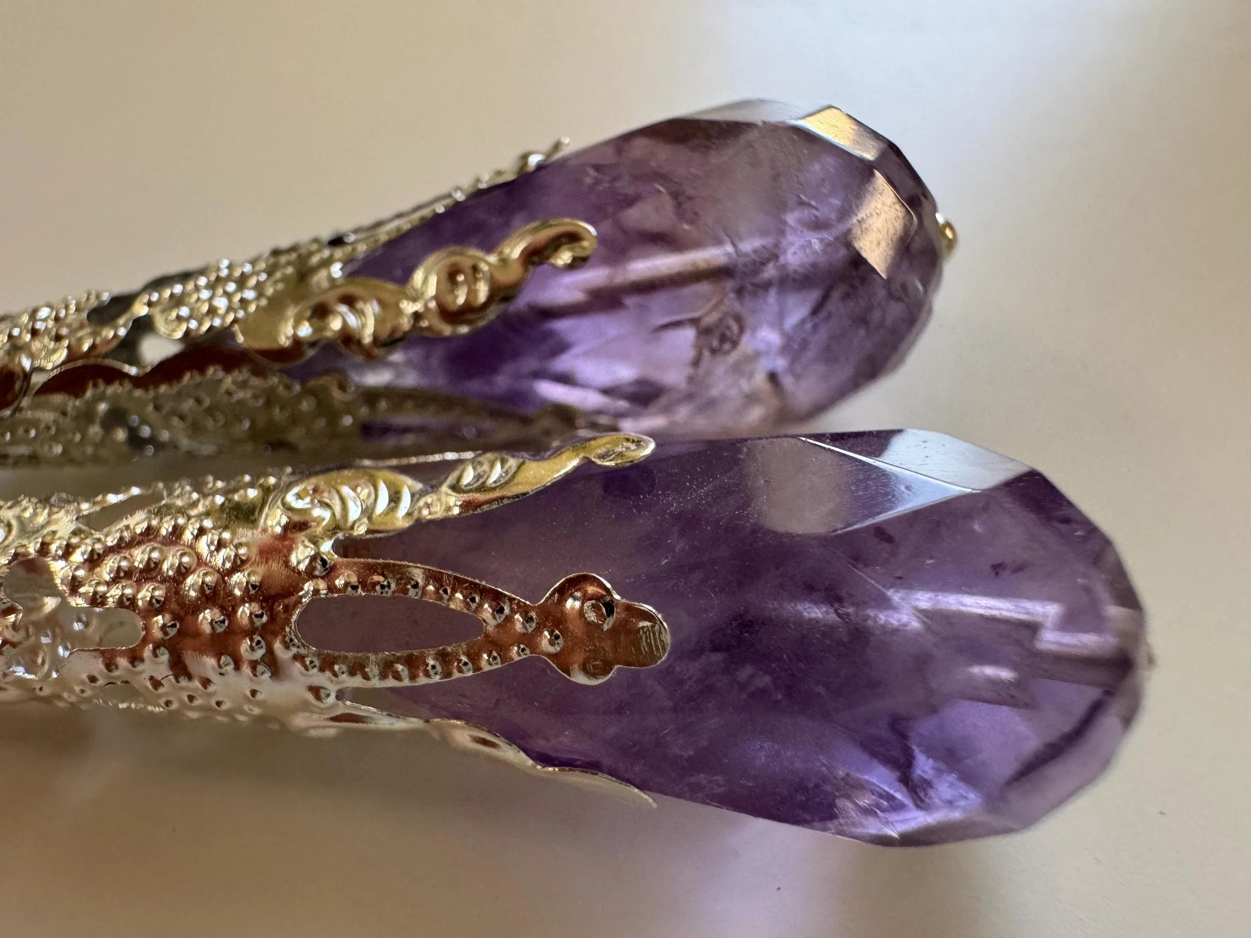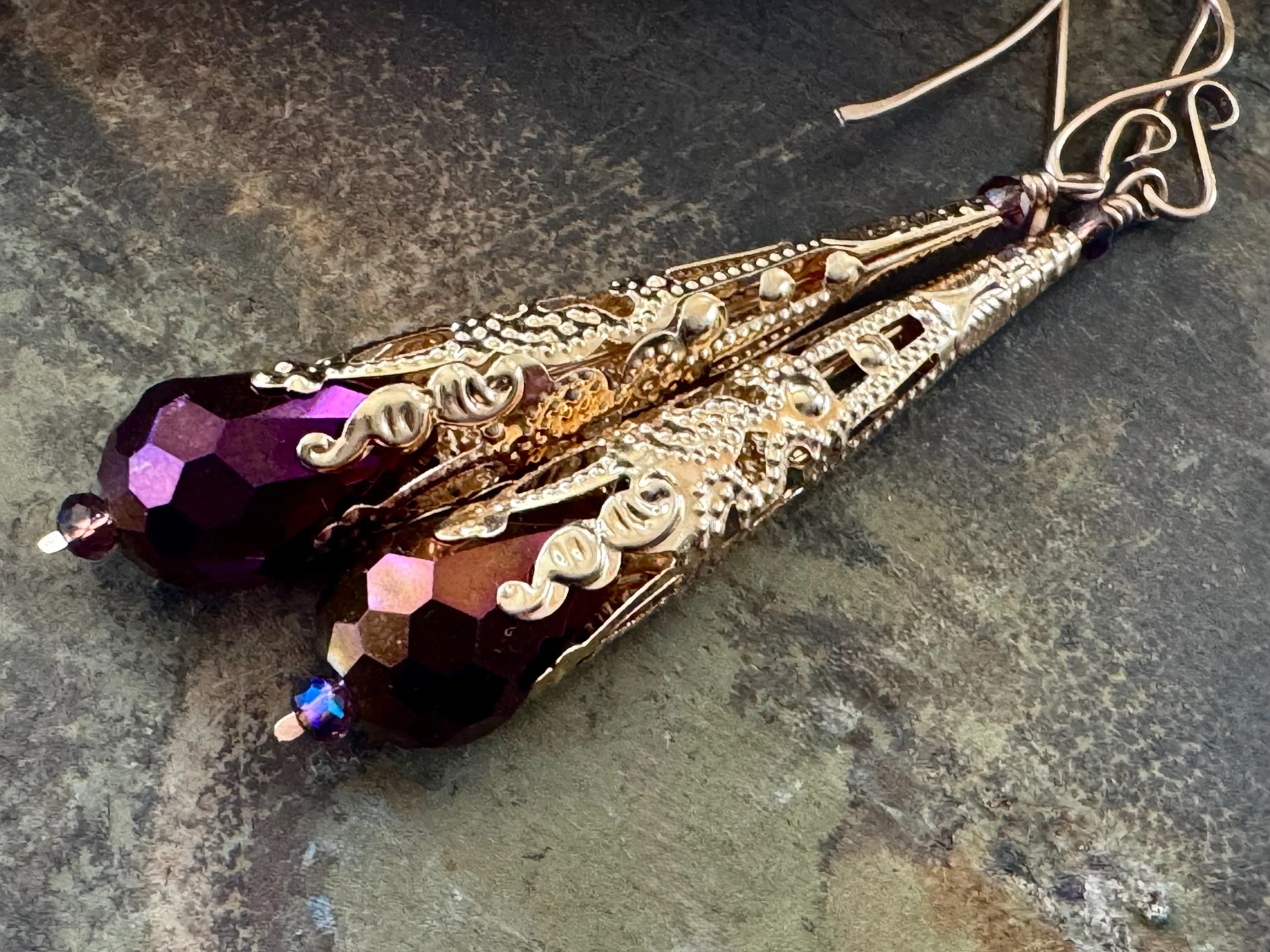 Elegant Amethyst Dangles: Handcrafted Bronze & Gold Statement Earrings