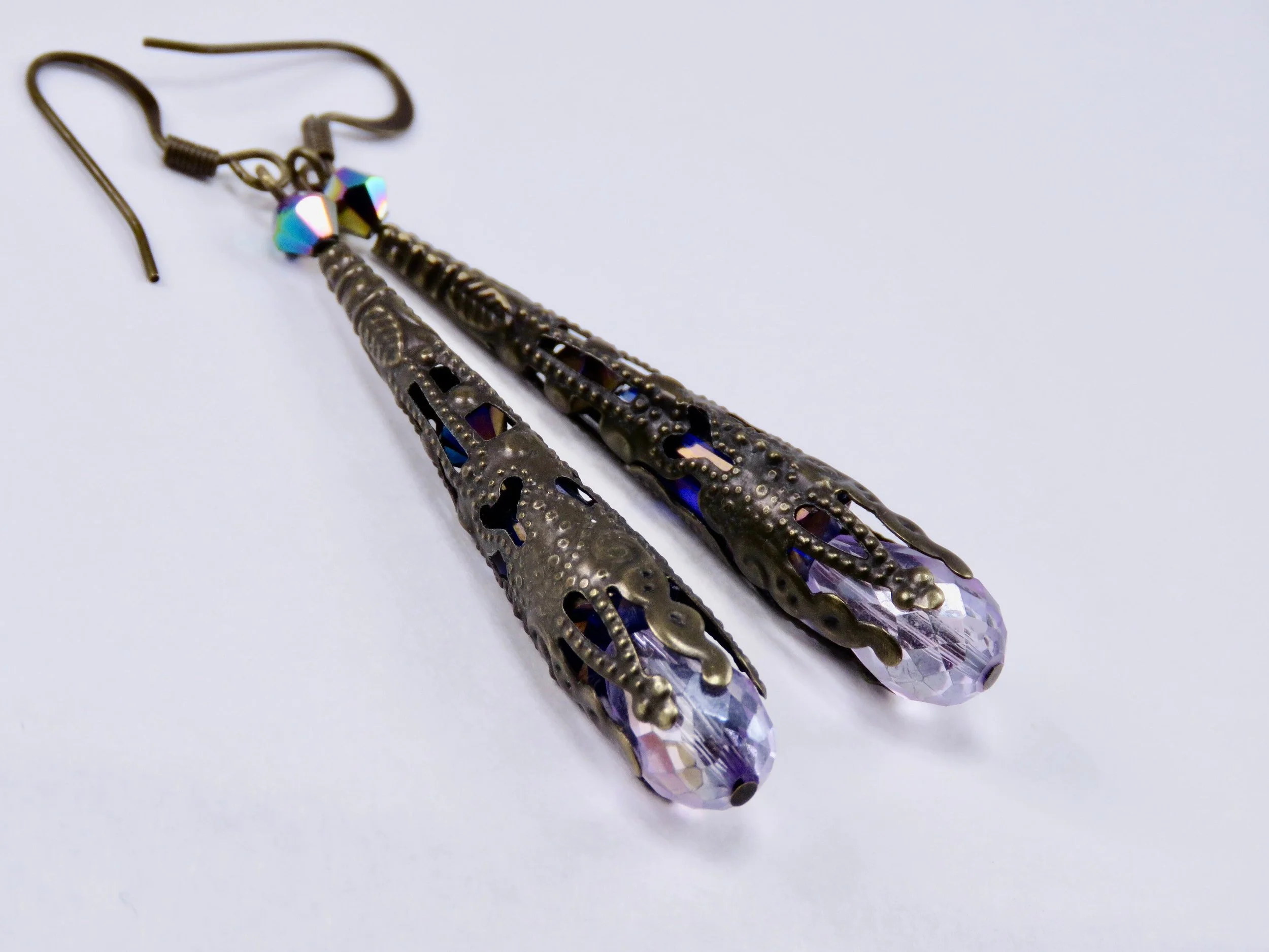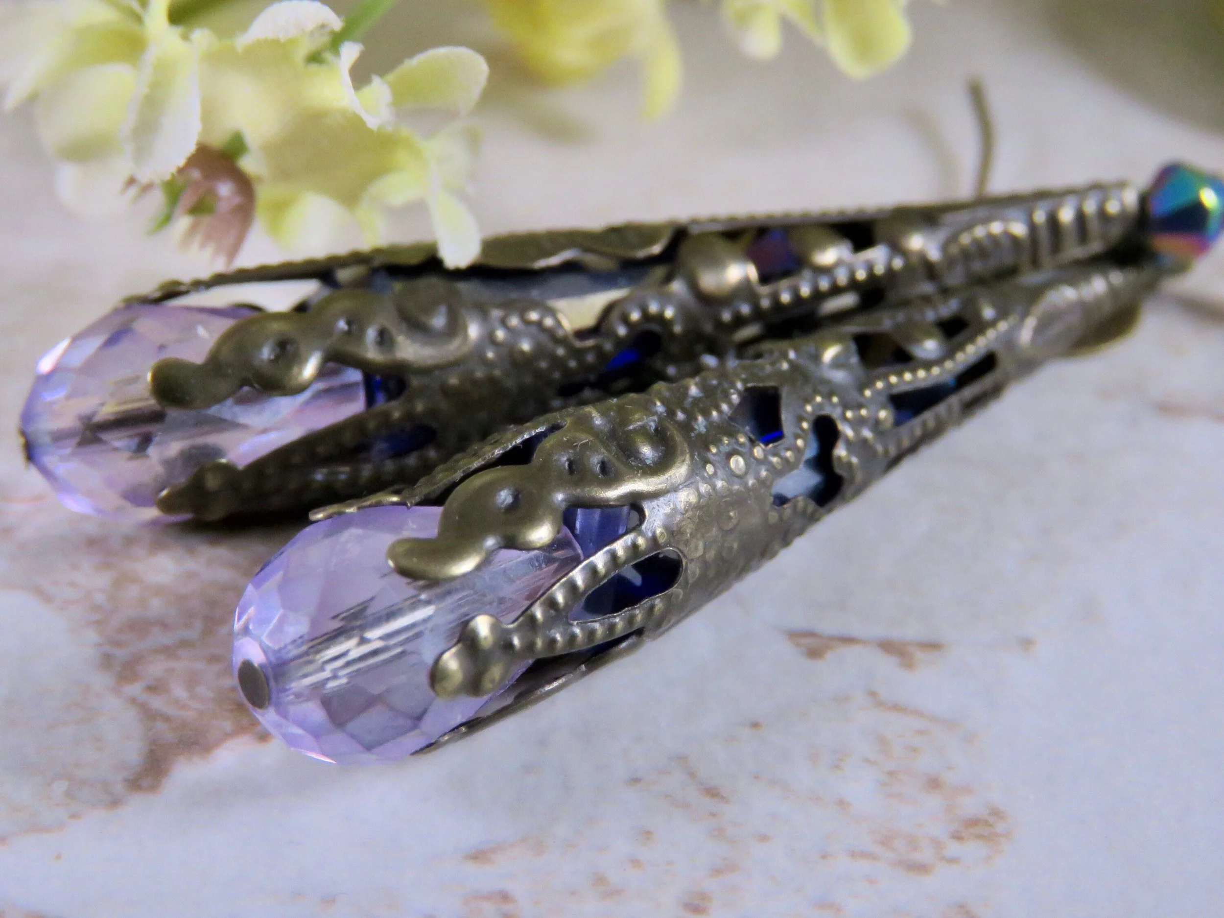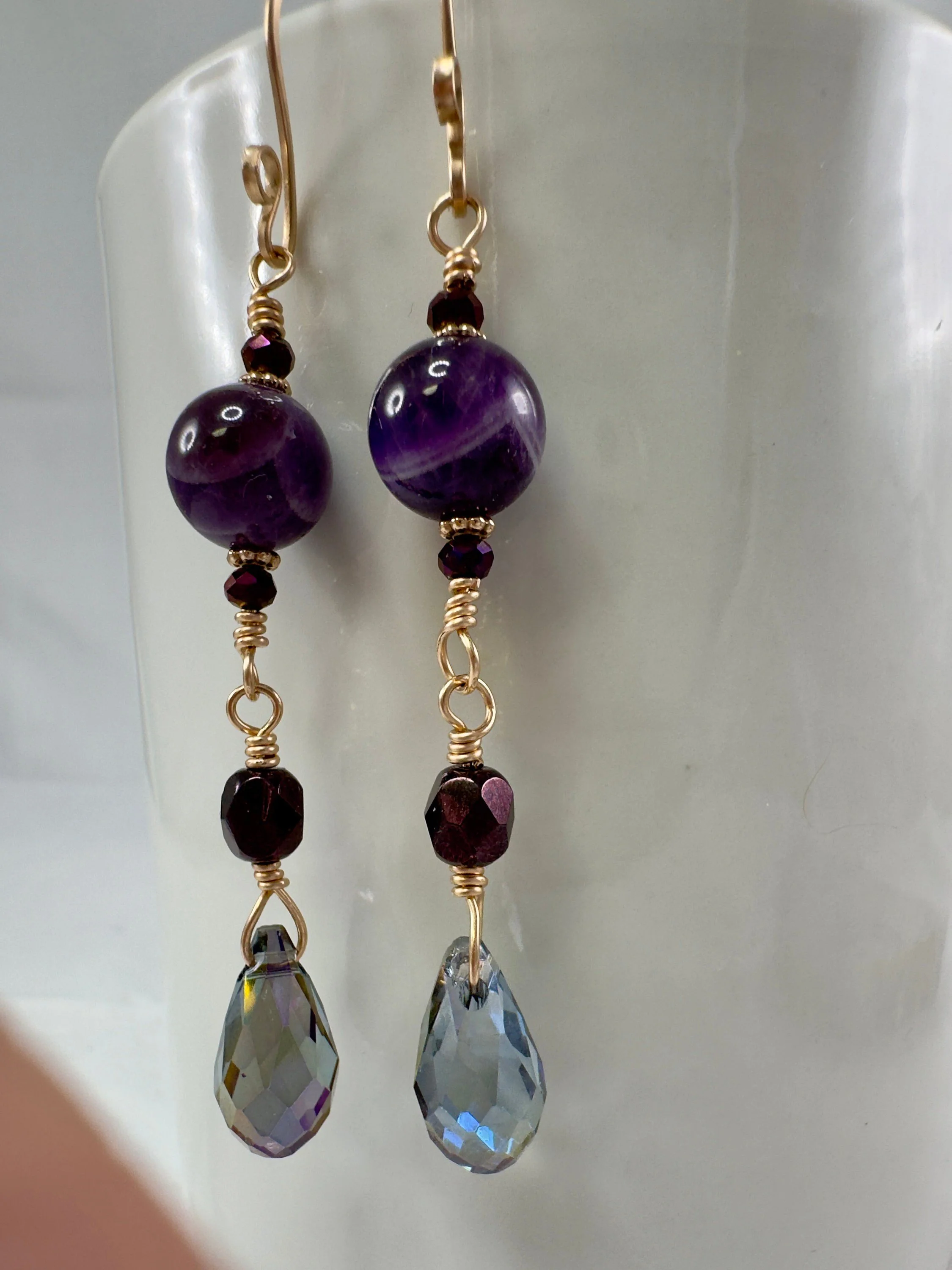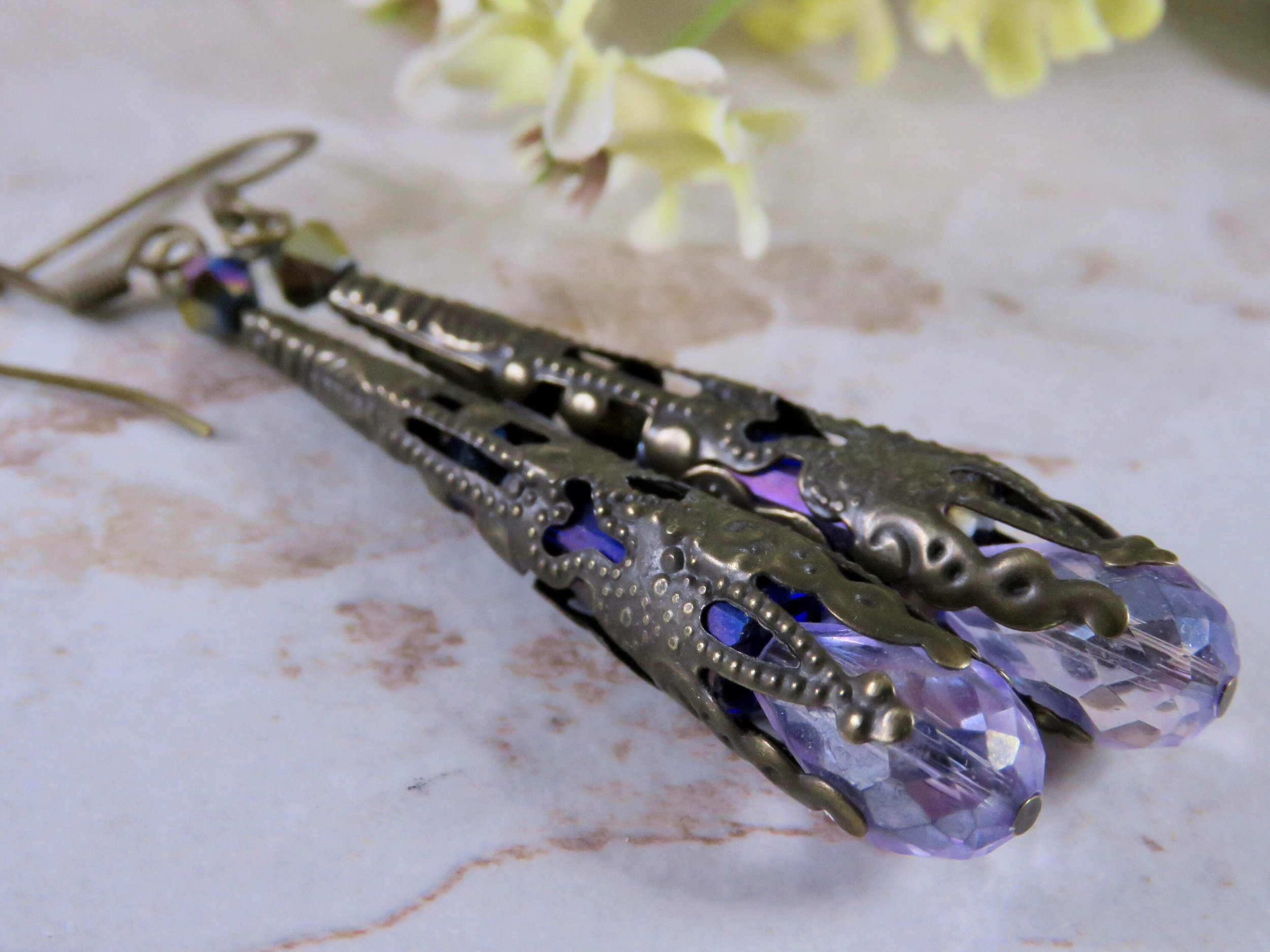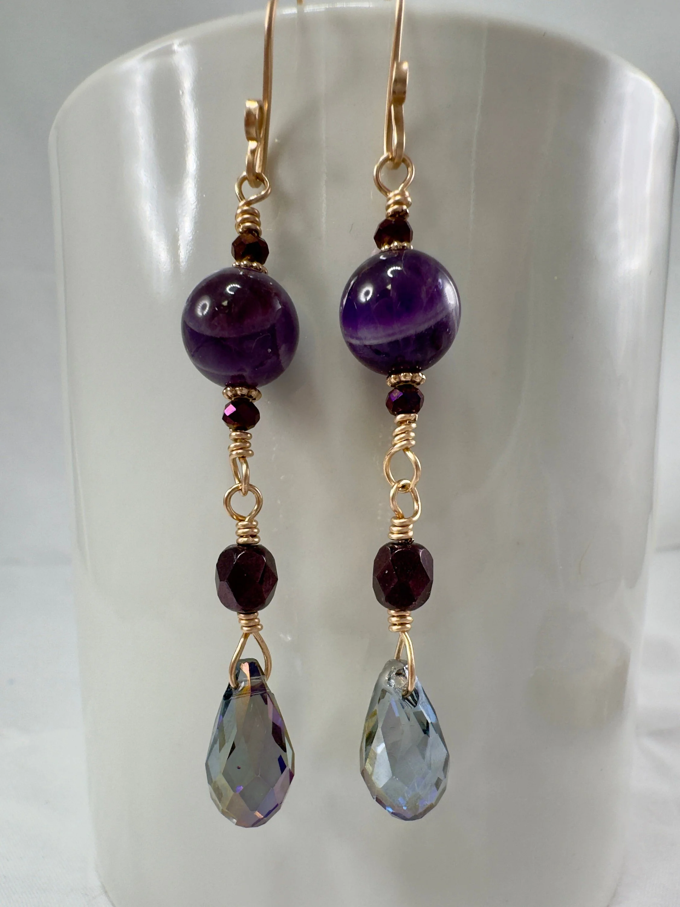 Elegant Amethyst Dangles: Handcrafted Bronze & Gold Statement Earrings